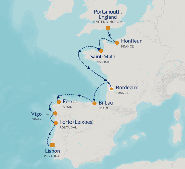 Embark on an 11-night Wine & Culture voyage, beginning in Portsmouth, England. Explore the charming coastal town of Honfleur, France, renowned for its picturesque harbor and artistic heritage. Continue to St. Malo, where medieval ramparts and Breton culture await, followed by a relaxing day at sea.