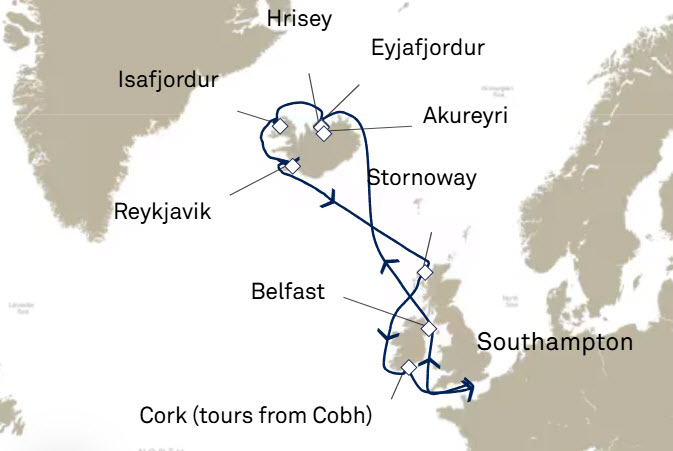 July 31, 2026 | Fri. | Akureyri, Iceland, Eyafjordur Scenic Cruising, Hrisey Sail By | 8:00am | 7:30pm |